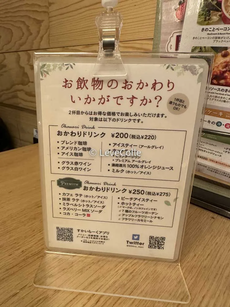 むさしの森コーヒーでは「おかわりドリンク」というものがあり、範囲内のドリンクであれば200円+税でもう1杯おかわりできるのですが、アプリクーポンを使えばおかわりが無料でできます。